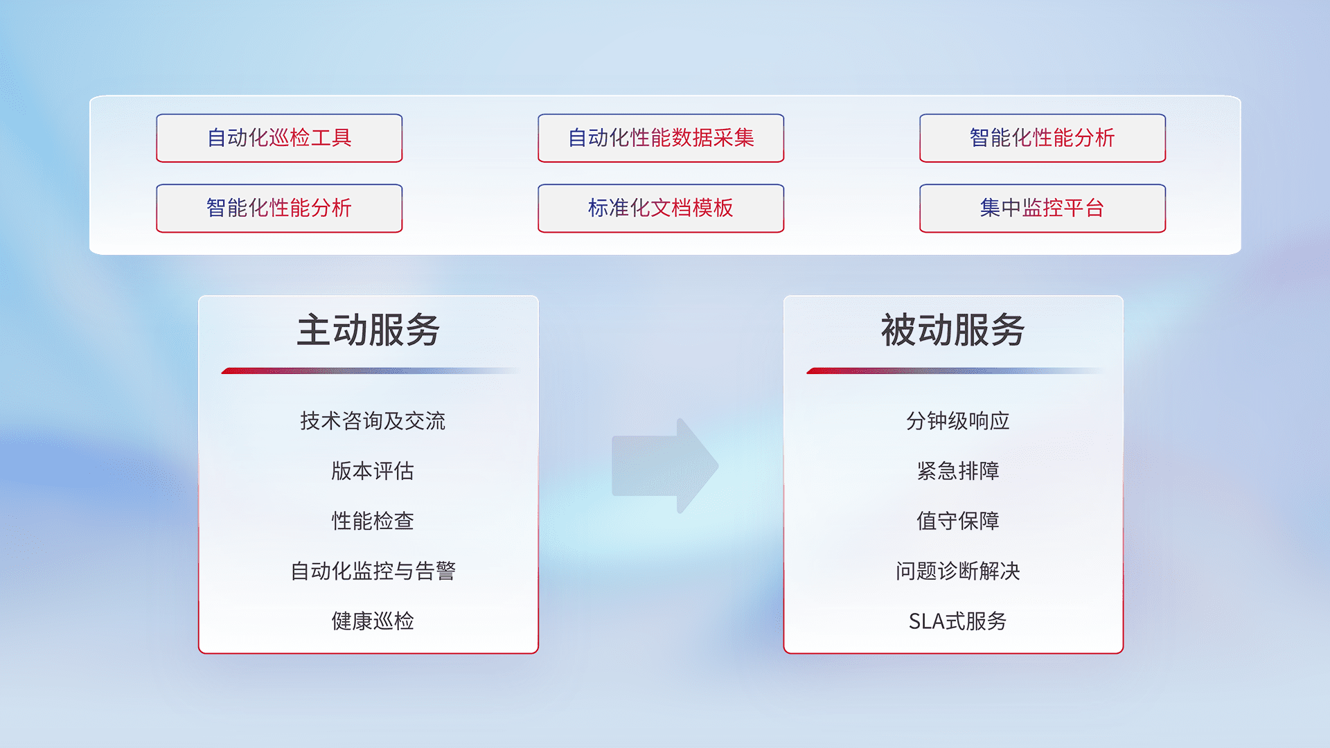 智能化工具和标准化文档,,,,保障服务质量,,,,提供主动服务(包含技术咨询、、版本评估、、性能检查、、、自动化监控与告警、、、健康巡检)和被动服务包含(分钟级响应、、紧急排障、、值守保障、、、问题诊断解决、、、、SLA服务)。。