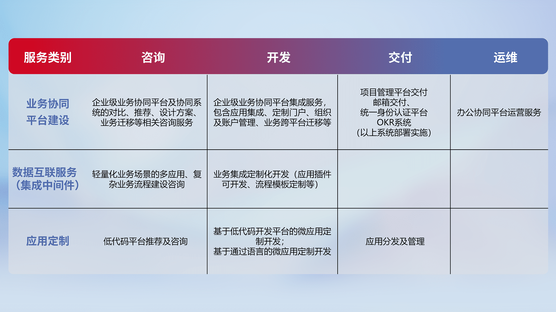 针对钉钉、、企微、、、IDaas等平台级产品提供产品的规划、、、方案、、交付、、、定制化开发等服务,,,,实现如统一协同办公、、、、智能客户服务、、、混合会议管理、、、、智能数据查询、、、等业务场景,,,实现数字化转型。。